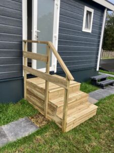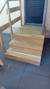 Luxe trap met bordes gedeelte van 100CM bij 100CM Klassieke uitvoering: 3-treeds Bordestrap 100CM breed tot maximaal 60cm hoogte met de derde trede een bordes van 100CM bij 100CM met leuning links of rechts