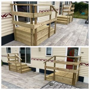 Robuuste trap met bordes gedeelte van 100CM bij 100CM 3-treeds Bordestrap 100CM breed tot maximaal 60cm hoogte met de derde trede een bordes van 100CM bij 100CM met leuning rondom